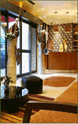 There is a 24 hour reception area that overlooks a small patio with multilingual staff